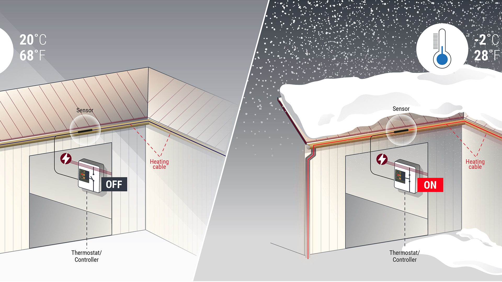 融化后再凝結的冰會損壞屋面和天溝。沉重的冰柱可能會掉落而造成損傷。瑞侃系統在天溝內的冰雪積聚之前就將其融化。確保融化的冰雪順暢地通過天溝和落水管排走。